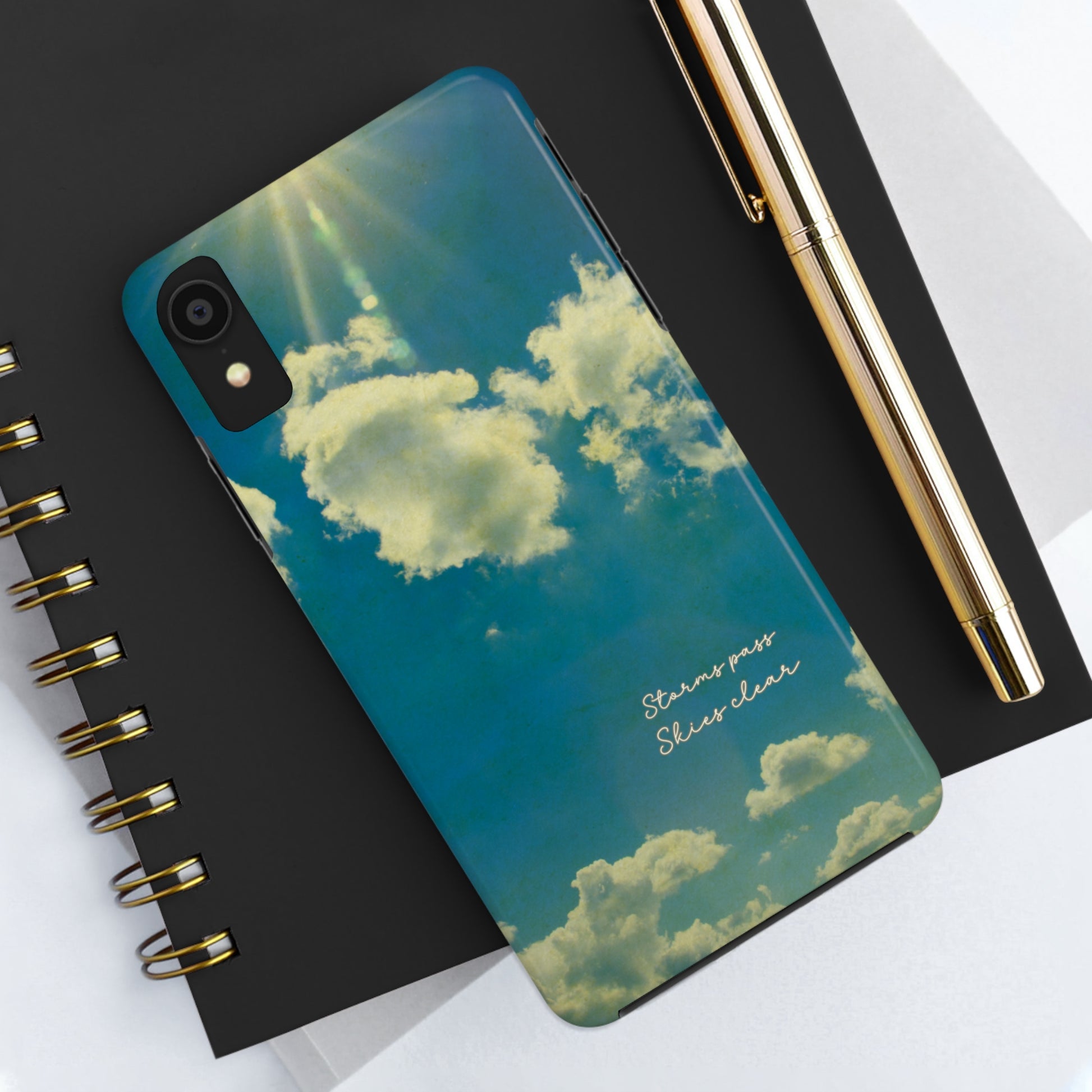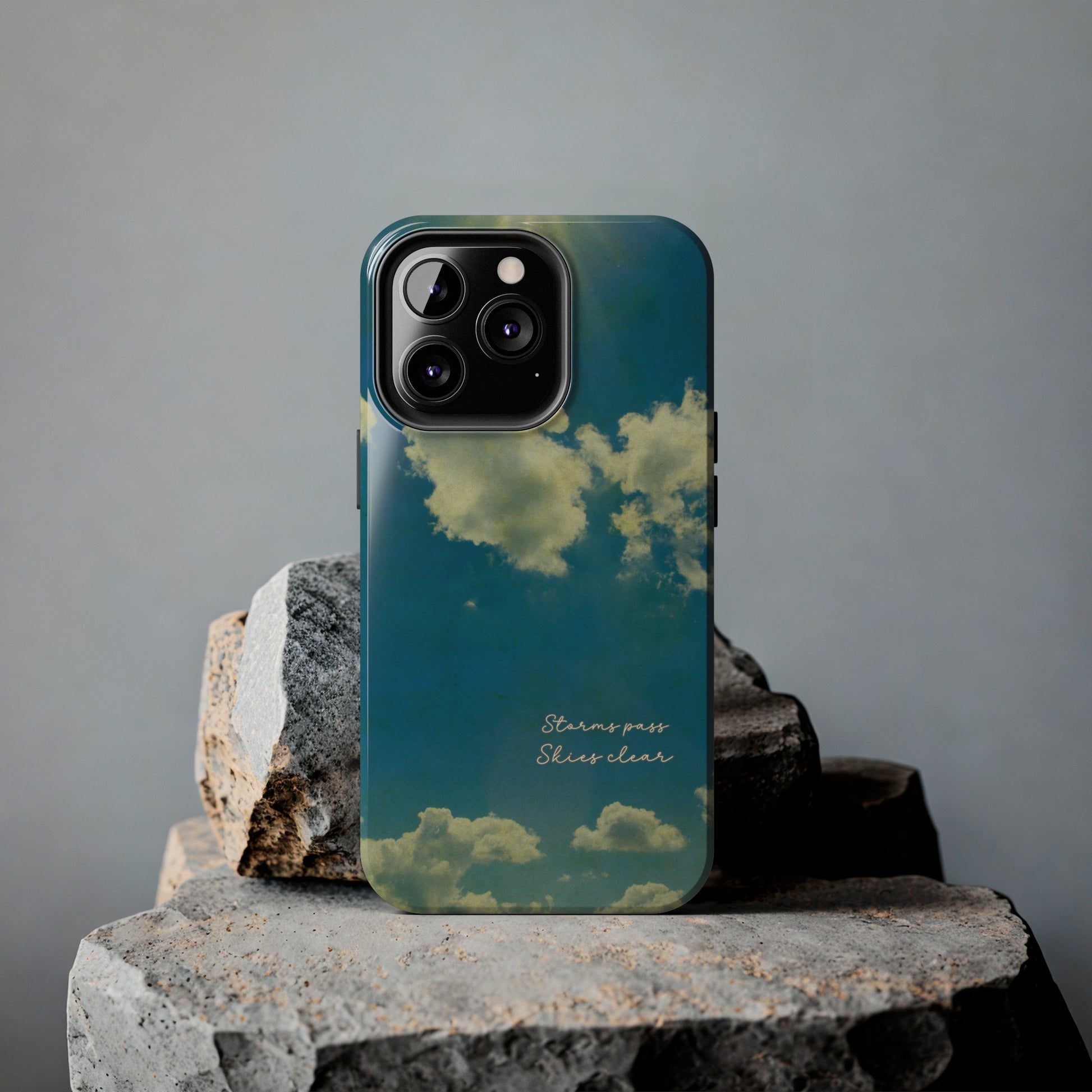 Don't let life's storms bring you down—this phone case is here to remind you that brighter days will come! With its vivid blue sky and fluffy clouds, "Storms Pass, Skies Clear" will lift your spirits—and your phone—in style.