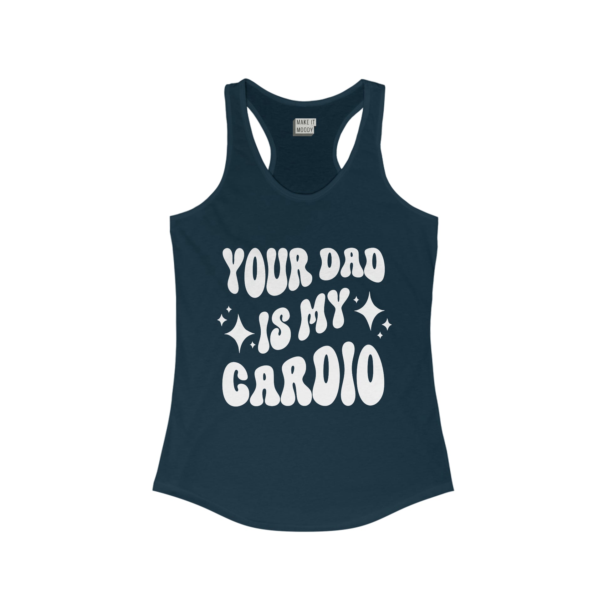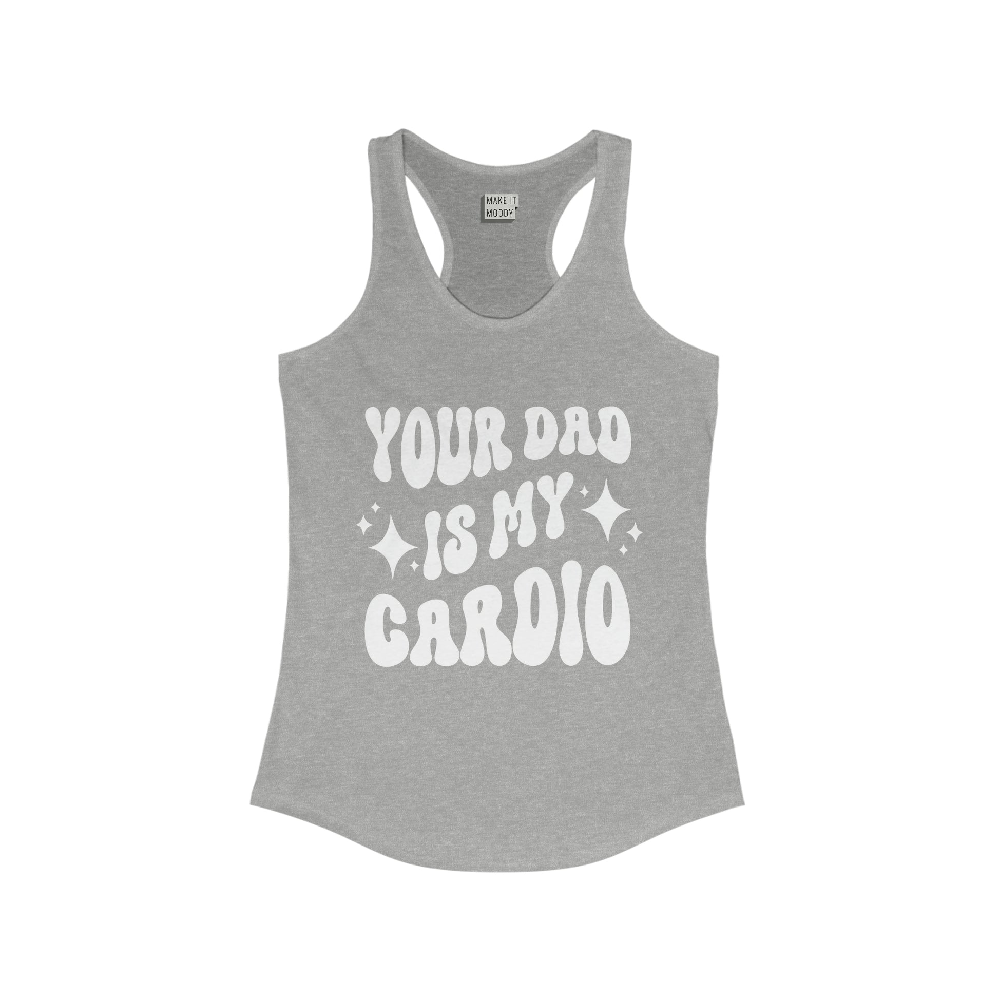 This funny gym tank for women features the phrase, "Your dad is my cardio." Perfect for breaking the ice at the gym or running errands - it's sure to get some laughs.